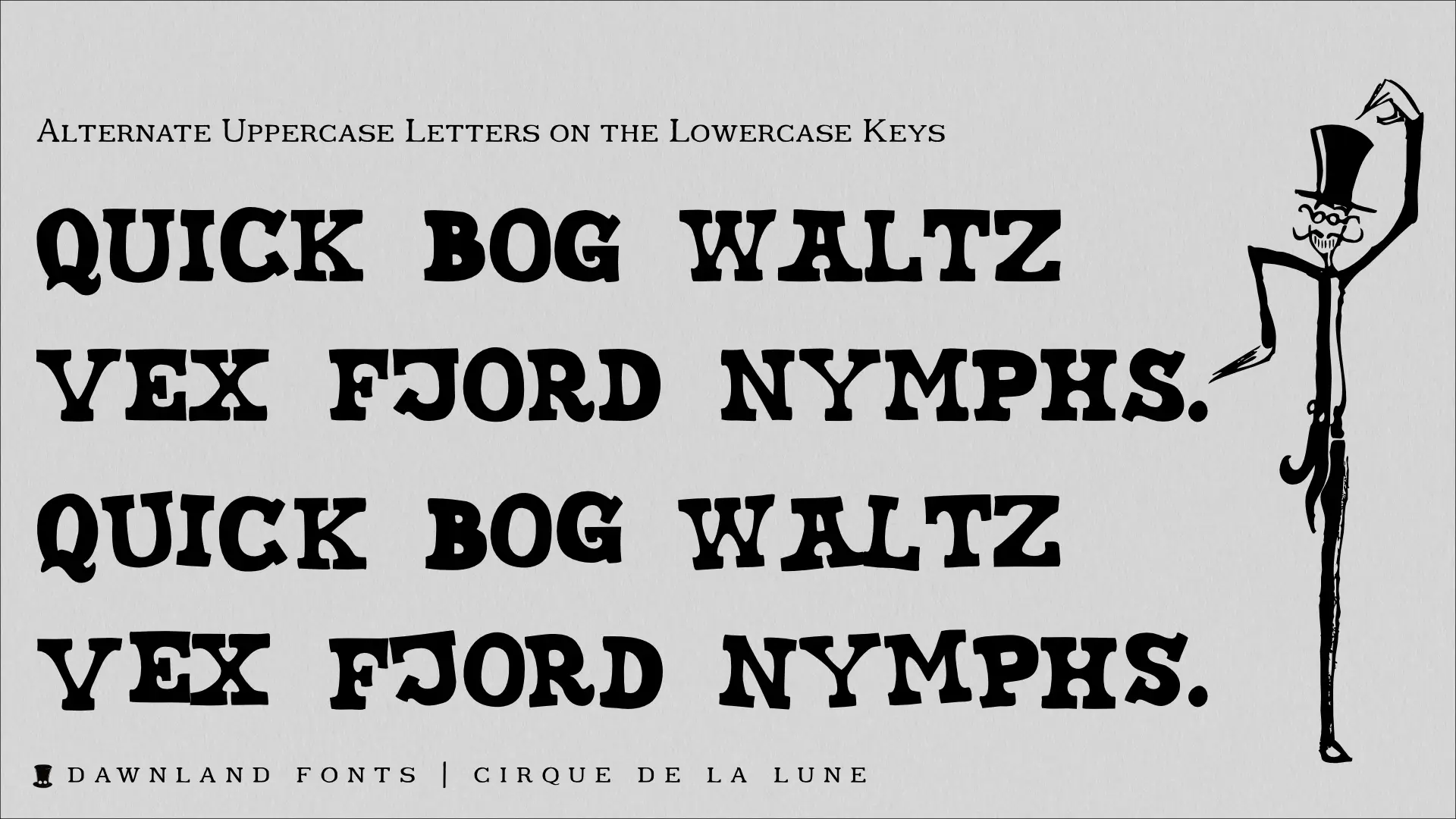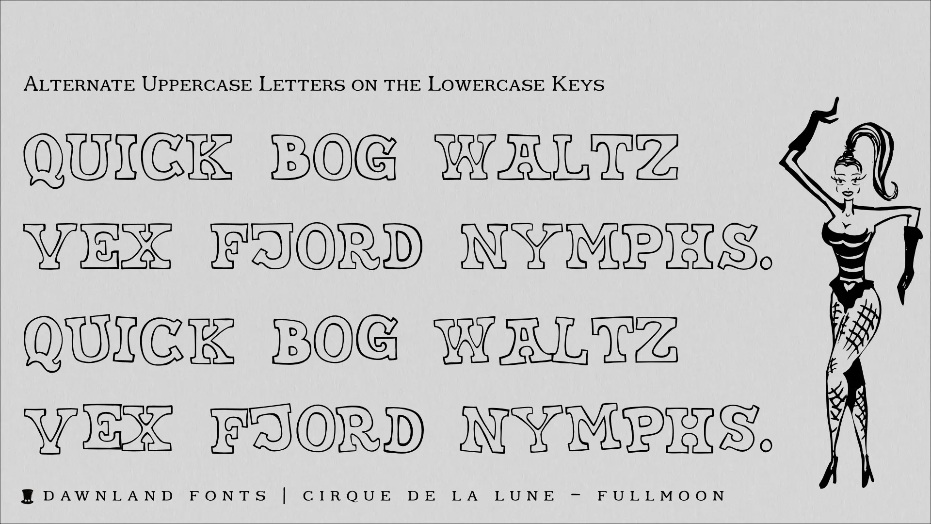 Cirque de la Lune November 17, 2018Fontsadmin Cirque de la Lune Cirque de la Lune is an uppercase only poster/display/headline font in two variants – Eclipse (regular) & Fullmoon (outline). Alternate, nudged or slightly rotated uppercase letters are placed on the lower case keys!